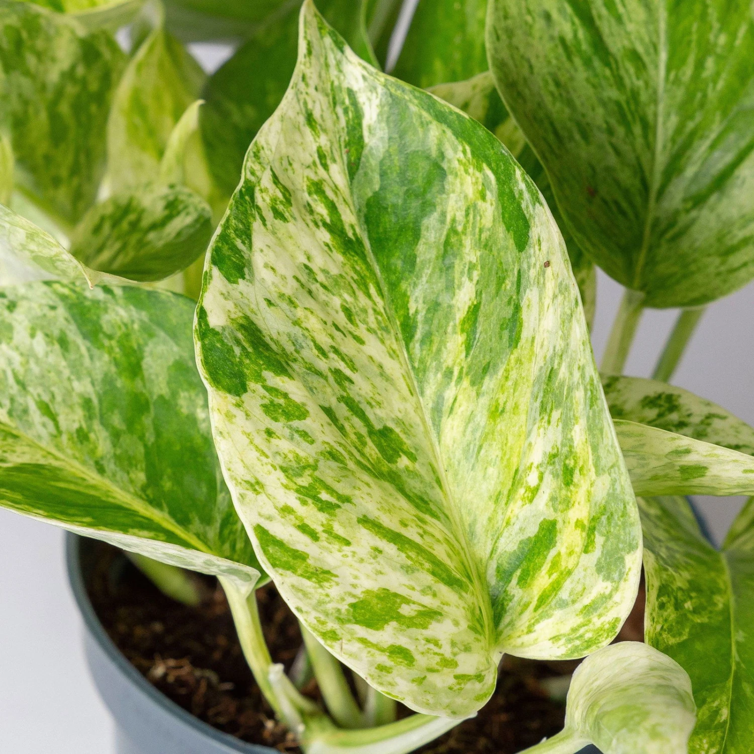 Die Efeutute, Epipremnum pinnatum ‚Marble Queen‘ (syn. Epipremnum aureum ‚Marble Queen‘), ist eine anspruchslose und mit ihren grün-weiß panaschierten Blättern zugleich dekorative kletternde oder hängende Blattschmuckpflanze. Die Efeutute ist eine nahezu perfekte Zimmerpflanze für Anfänger oder fürs Büro, die etliche Fehler wie seltenes Gießen oder nur sporadisches Düngen verzeiht. Mit zu häufigen Wassergaben können Sie dagegen der Efeutute erhebliche Schäden zufügen. An einem hellen, absonnigen oder auch halbschattigen bis schattigen Standort fühlt sich Ihre Pflanze sofort wohl. Zugluft und direkte Sonneneinstrahlung sind dagegen zu vermeiden. Sogar im Winter dürfen die Lufttemperaturen nicht dauerhaft unter 16 Grad sinken. Die Epipremnum pinnatum gehört zu den beliebten Raumklimapflanzen und entzieht der Luft Benzole, Nicotin und weitere Schadstoffe. Bitte stellen Sie Ihre Efeutute außerhalb der Reichweite von Kindern oder Haustieren auf, da der Pflanzensaft giftig ist.
